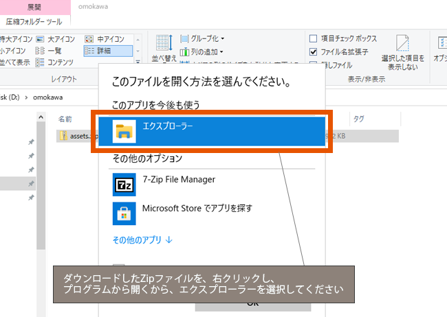 ダウンロードしたZipファイルを、右クリックし、「プログラムから開く」から、「エクスプローラー」を選択してください。