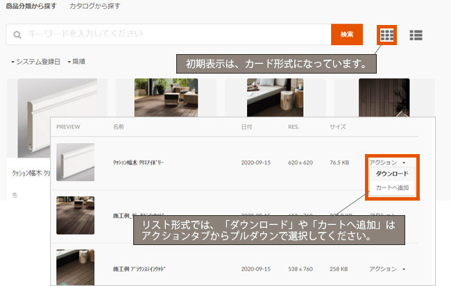 施工例画像だけを集めたい時、カラーバリエーション画像をまとめて入手したい時など、様々なシーンで活用いただけます。
