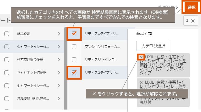 親階層にチェックを入れると、子階層まですべて含んでの検索となります。選択した分類は検索画面に表示され、×をクリックすると選択が解除されます。